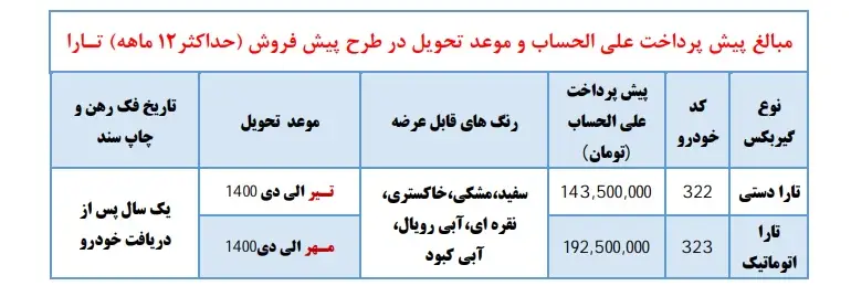طــرح پــیش فــروش (حــداکثر 12 ماهــه) محصـول تــارا ( بــه روش قرعـه کشی) مط ـابق جــدول ذیل از روز شنبه مورخ 20-10-99 شروع و تا پایان روز دوشنبه مورخ 22-10-99 ادامه خواهد داشت. مطابق با بخشنامه شماره 4249 دریافت کد کاربري و کلمه عبور قبل از ثبت نام در سایت فروش اینترنتی از الزامات ثبت نام میباشد. لذا بدیهی است در صورت عدم دریافت کد کاربري و کلمه عبور،امکان ثبت نام میسر نخواهد بود.