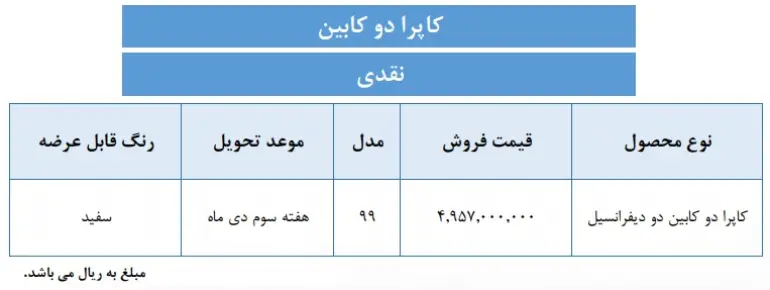 طرح جدید فروش فوری و نقدی پیکاپ کاپرا از سوی گروه بهمن ویژه آذرماه 99 آغاز خواهد شد.شرایط فروش نقدی با قیمت قطعی این محصول از روز دوشنبه مورخ 17 آذرماه 99 ساعت 9 صبح لغایت ساعت 18 همان روز فعال خواهد بود.