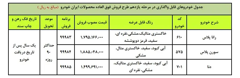 گروه صنعتی ایران خودرو در یازدهمین مرحله فروش فوق العاده محصولات خود، 3 محصول دنا ، رانا پلاس و سورن پلاس را با موعد تحویل 90 روز عرضه میکند. این طرح از روز سه شنبه 23 دی ماه به مدت سه روز به اجرا گذاشته میشود.