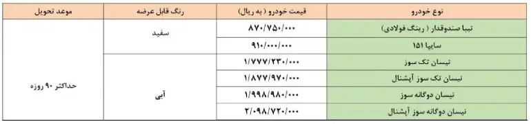 خودروهای ارائه شده در این طرح شامل : تیبا صندوقدار ، پراید 151 ، نیسان زامیاد ( تک سوز، دوگانه ، آپشنال ) با موعد تحویل حداکثر 90 روز میباشند.