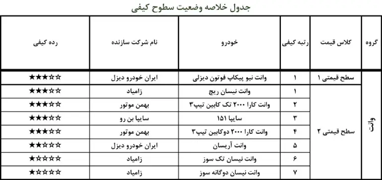در بین خودروهای وانت نیز پیکاپ فوتون با کیفیت ترین وانت و نیسان وانت زامیاد بی کیفیت ترین خودرو وانت داخلی ارزیابی شده اند.