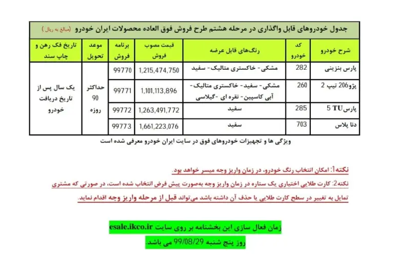 طــرح فــروش فــوق الــعــاده (3 مــاهــه)مــحصـــولات ايــران خــودرو مــطــابــق جــدول ذيــل از روز پنج شنبه مورخ 29-08-99 شروع و تا روز شنبه مورخ 01-09-99 ادامه خواهد داشت. حداكثر 3 روز كاري پس از پايان ثبت نام،قرعه كشي برگزار و اسامي منتخبان اعلام خواهد گرديد.